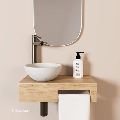 Dit samengestelde product heeft de plek van de terrazzo waskom aan de linkerkant en de handdoekhouder rechts. De positie van de fonteinkraan kun je zelf bepalen, het gat hiervoor dient door jezelf of de installateur geboord te worden (Ø 28 mm). Dat gaat heel gemakkelijk met een houtboortje.