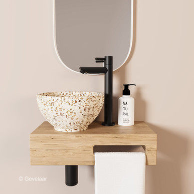 Dit samengestelde product heeft de plek van de terrazzo waskom aan de linkerkant en de handdoekhouder rechts. De positie van de fonteinkraan kun je zelf bepalen, het gat hiervoor dient door jezelf of de installateur geboord te worden (Ø 28 mm). Dat gaat heel gemakkelijk met een houtboortje.