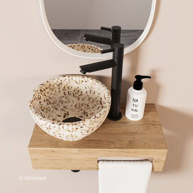 Tanaro Oasis fonteinset eikenhout kraanset mat zwart waskom terrazzo beige links