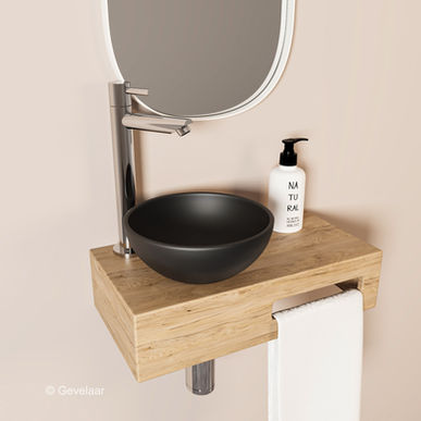 Dit samengestelde product heeft de plek van de glans witte waskom aan de linkerkant en de handdoekhouder rechts. De positie van de fonteinkraan kun je zelf bepalen, het gat hiervoor dient door jezelf of de installateur geboord te worden (Ø 28 mm). Dat gaat heel gemakkelijk met een houtboortje.