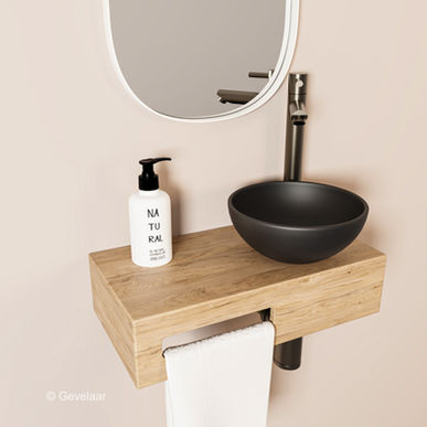 Dit samengestelde product heeft de plek van de glans witte waskom aan de linkerkant en de handdoekhouder rechts. De positie van de fonteinkraan kun je zelf bepalen, het gat hiervoor dient door jezelf of de installateur geboord te worden (Ø 28 mm). Dat gaat heel gemakkelijk met een houtboortje.