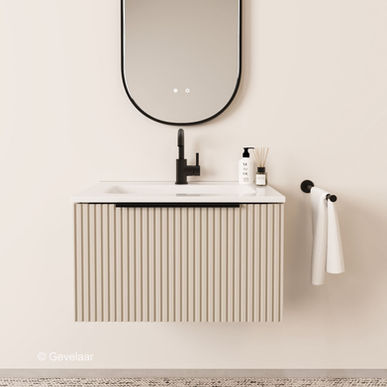Tip: De Sobio Rib ribbelfront cappuccino badkamermeubel 70 cm. combineert erg goed met onze wastafelkranen, sifons en wastes. Sluit je opbouw wastafelkranen aan met onze hoekstopkranen. Ook is er een bijpassende ribbelfront cappuccino hoge kast.