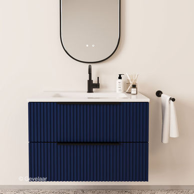 Tip: De Sobio Rib ribbelfront intens blauw badkamermeubel 80 cm. combineert erg goed met onze wastafelkranen, sifons en wastes. Sluit je opbouw wastafelkranen aan met onze hoekstopkranen. Ook is er een bijpassende ribbelfront intens blauw hoge kast.