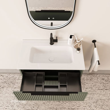 Een compleet Sobio Rib ribbel olijf groen badkamermeubel 80cm - wastafel glans wit bevat de volgende onderdelen. ↓