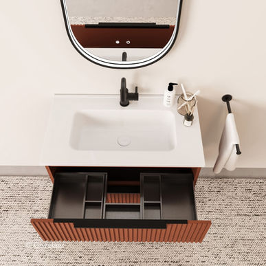 Tip: De Sobio Rib ribbelfront terracotta badkamermeubel 80 cm. combineert erg goed met onze wastafelkranen, sifons en wastes. Sluit je opbouw wastafelkranen aan met onze hoekstopkranen. Ook is er een bijpassende ribbelfront terracotta hoge kast.