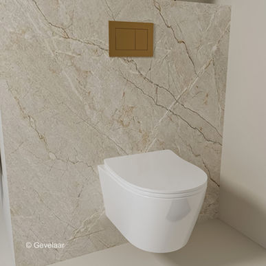 De set bestaat uit een solide TECE inbouwreservoir, een strak vormgegeven Tanaro Pizarro wandcloset in glans wit (met softclose, quick release en diepspoel), en het bijpassende TECE Now bedieningspaneel in geborsteld goud. Dankzij de zwevende montage oogt de toiletruimte ruimtelijker én is deze eenvoudig schoon te houden.