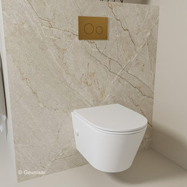 De set bestaat uit een solide TECE inbouwreservoir, een strak vormgegeven Vesta rimless flatline wandcloset in mat wit (met softclose, quick release en diepspoel), en het bijpassende TECE Loop 2 bedieningspaneel in geborsteld goud. Dankzij de zwevende montage oogt de toiletruimte ruimtelijker én is deze eenvoudig schoon te houden.