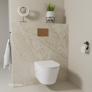 De set bestaat uit een solide TECE inbouwreservoir, een strak vormgegeven Vesta rimless flatline wandcloset in mat wit (met softclose, quick release en diepspoel), en het bijpassende TECE Now bedieningspaneel in rood brons. Dankzij de zwevende montage oogt de toiletruimte ruimtelijker én is deze eenvoudig schoon te houden.