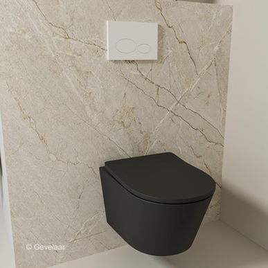 De set bestaat uit een solide Geberit UP320 inbouwreservoir, een strak vormgegeven Vesta Tornado shade wandcloset in mat zwart (met softclose, quick release en tornado flush), en het bijpassende Wiesbaden X32 bedieningspaneel in glans wit. Dankzij de zwevende montage oogt de toiletruimte ruimtelijker én is deze eenvoudig schoon te houden.
